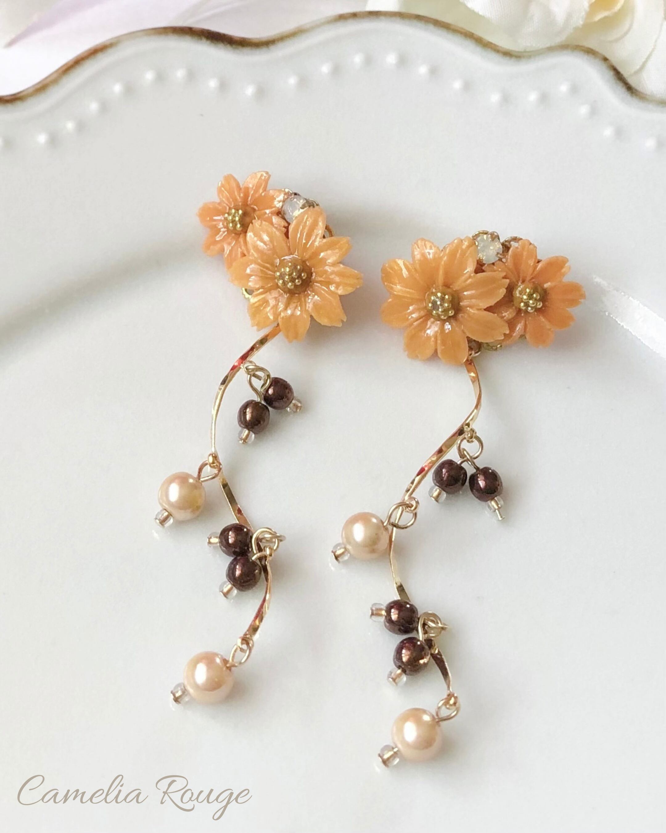 ~流れるように咲く~黄花秋桜のイヤリング(アンティークオレンジ)